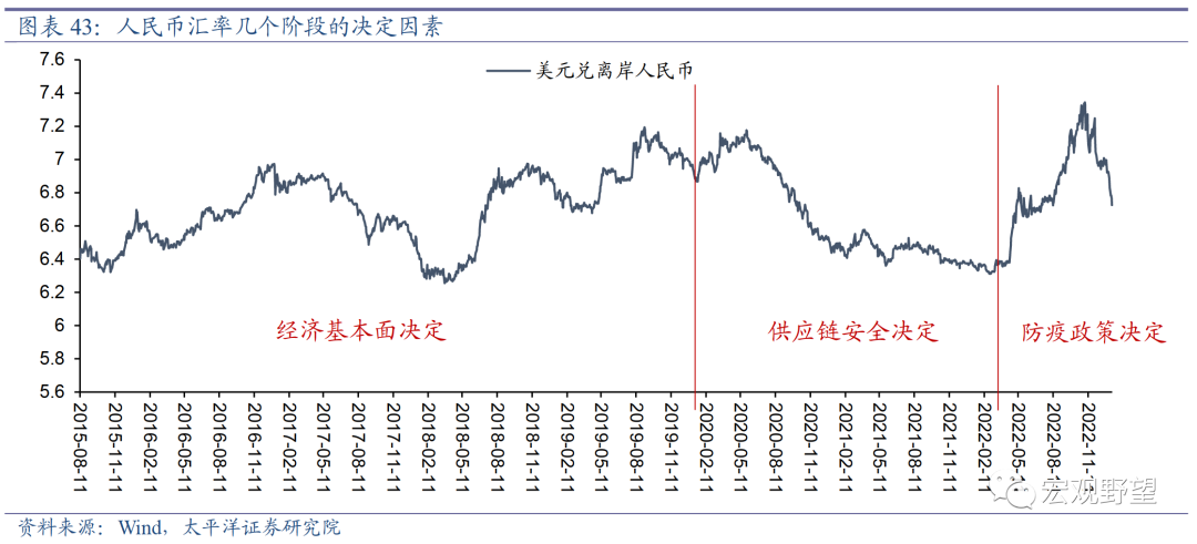 债市的环境则相对不利。我们认为疫情后中国经济将会出现较为强劲的复苏,而且当前宏观政策对于房地产的支持力度不断增加,不达目标不罢休。这些因素会共同推动私人部门的信用扩张,从而驱动市场利率逐级上行。虽然未来疫情预计还会有反复,带来债市阶段性的交易机会,但是从方向上来看,利率上行是大的趋势,对于债券不利。4.2. 人民币转入升值周期2022年以来,疫情形势及防控政策的变化是决定人民币汇率的核心因素。在2015年“811”汇改之后,2020年疫情爆发之前,经济基本面走势决定了人民币汇率的方向。在2020年及2021年的新冠原始毒株及德尔塔病毒时代,供给能力及供应链安全是决定汇率的主要因素,强劲的出口拉动人民币无视国内经济基本面的走弱而持续升值。但在2022年的奥密克戎病毒时代,传统的疫情防控措施已经很难以较小代价实现“清零”,中国的供应链在较多的封控影响下也不再安全,所以疫情形势及防控政策成为了人民币汇率的新的决定因素。因此,2022年3月份国内疫情的反弹及防控政策加码是人民币进入贬值周期的转折点,疫情防控加码导致经济长期前景走弱。而11月份的防疫政策转向则是人民币进入升值周期的标志,虽然出口和短期的疫情反弹都对汇率不利,但对于长期经济前景的乐观情绪压倒了一切不利因素。随着第一波疫情已经达峰,我们认为对于人民币汇率而言最大的不确定性已经缓解。“东升西落”的背景下,人民币汇率升值是未来较长的趋势。