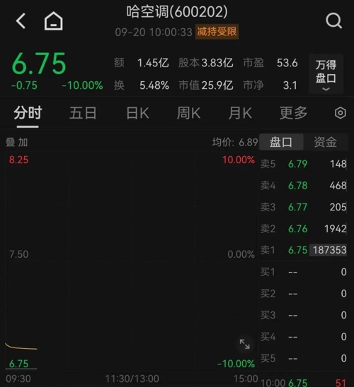 昨天涨停的哈空调也被摁在跌停板上。