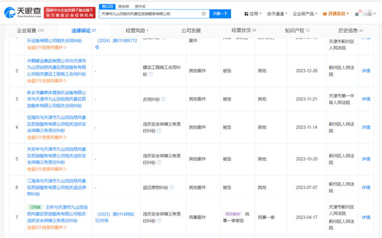 此外,因景区安全带风险隐患而被曝光的天津市九山顶自然风景区,天眼查法律诉讼信息显示,2023年以来,相关公司多次因“违反安全保障义务责任”成为司法案件被告。
