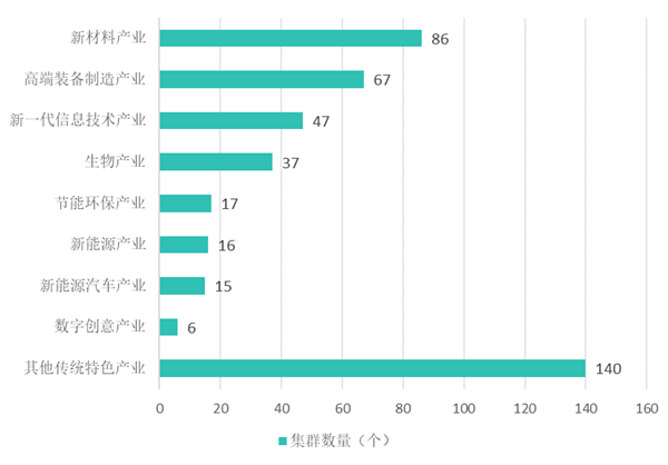 从前两批国家级中小企业特色产业集群产业分布来看,战略性新兴产业是国家级集群重点发展领域,共有160个国家级集群围绕战新产业集聚,占比达80%。其中,高端装备制造产业是战略性新兴产业的重点关注领域,共有50个集群入围。近年来国家高度关注战略性新兴产业,推进高端装备制造产业发展也是国家级中小企业特色产业集群建设的主要方向之一。新材料产业和新一代信息技术产业国家级集群数量次之,分别为43个和34个。