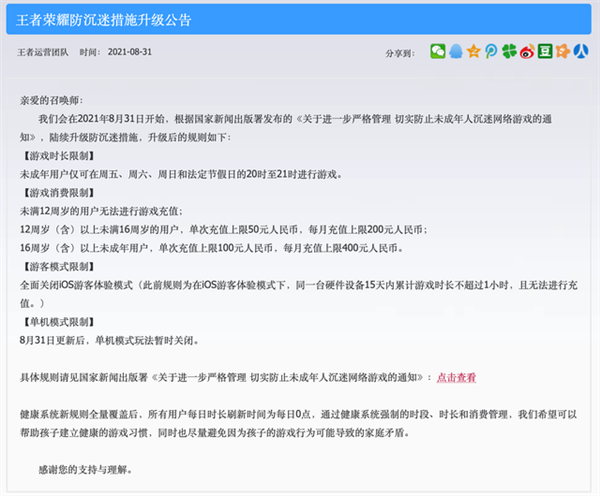 就在不久之前,国家新闻出版署下发《关于进一步严格管理 切实防止未成年人沉迷网络游戏的通知》,要求所有网络游戏企业严格限制向未成年人提供网络游戏服务的时间,仅可在周五、周六、周日和法定节假日每日20时至21时向未成年人提供1小时服务,其他时间均不得以任何形式向未成年人提供网络游戏服务。