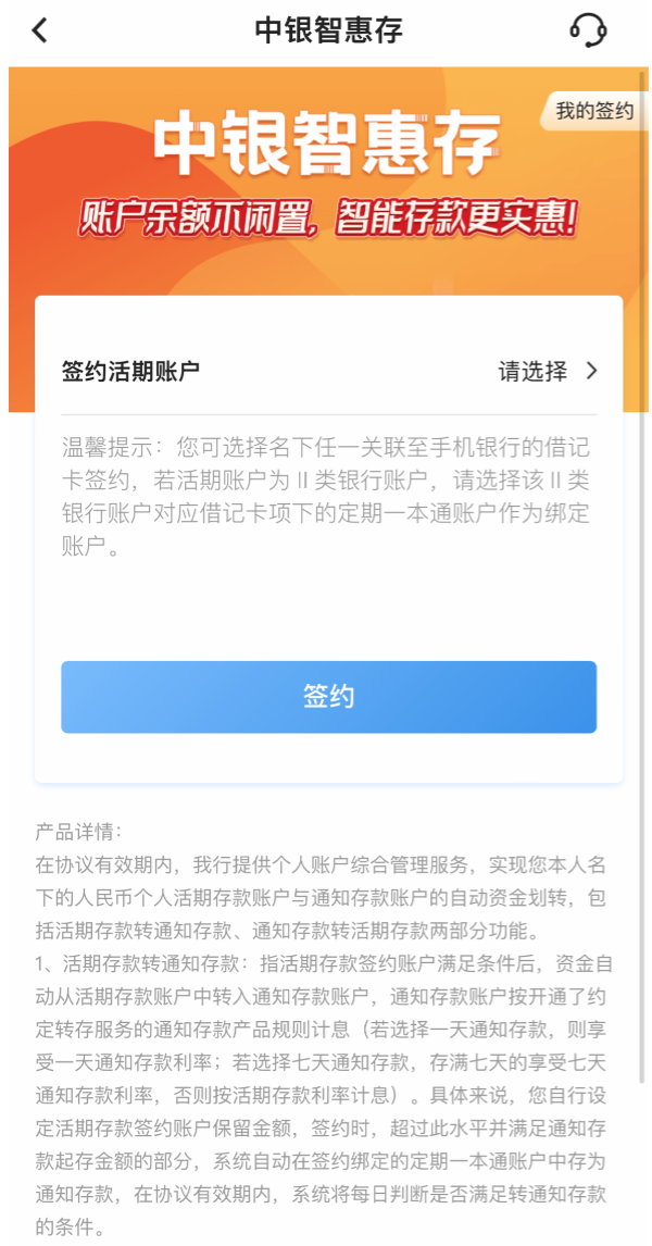 中国银行App显示,该行存款管理专区,“中银智慧存”即是智能通知存款产品。不过,截至目前该行未发布停止签约的提示信息。已签约的产品协议书显示,该产品利率为央行基准利率加0.5个百分点,在协议有效期内以7天为循环进行转存服务。