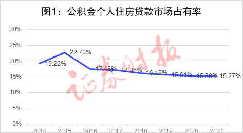 公积金贷款指标也呈现类似的特征。“个人住房贷款市场占有率”,是当年住房公积金贷款余额占全国商业性和公积金贷款余额之和的比率,体现了公积金贷款对整个房贷市场的贡献度。2015年末,公积金贷款市场占有率尚有22.7%,但随着房价的上涨,到2021年末该市场占有率已经下降至15.3%(图1)。说明对于购房者而言,公积金贷款在房贷中的作用逐年变小。