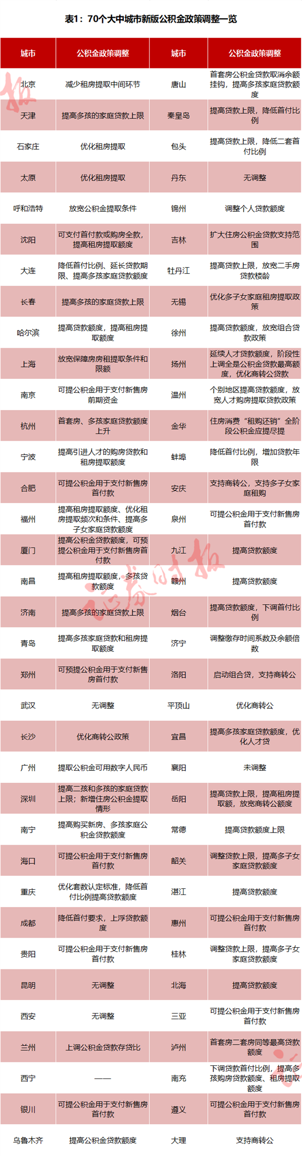 自去年7月国务院常务会议提出“因城施策促进房地产市场平稳健康发展”以来,各地公积金政策陆续做出调整。证券时报记者统计,目前至少有82个大中城市出台公积金新政支持住房消费,被纳入国家统计局监测的70个大中城市中,已有65个城市出台了更积极的公积金政策(表1)。其中,沈阳、大连、南京、青岛、郑州、合肥等13个城市已支持在购房首付中使用公积金。