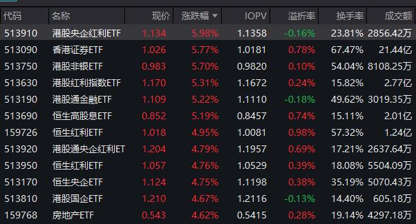 同日,跟地产股同一时间异动的还有保险、银行等金融股。当天,香港银行、保险板块涨幅达到4%。能源、电力等港股高股息板块也集体走强。另外,多只港股红利相关ETF涨超5%。其中,港股央企红利ETF、港股非银ETF、港股通金融ETF、港股红利指数ETF、港股通央企红利ETF等盘中均创出上市新高。对此,券商中国今天上午曾率先报道:《香港,突传大利好!》
