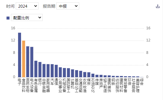 食饮重仓比例下行,为近 5 年历史最低水平,超配比例大幅降低:根据 2024Q2 基金重仓持股数据(本文剔除港股标的),食品饮料行业重仓基金达 4021 家,环比减少 1371 家;重仓持股总市值为 2864.09 亿元,环比下降 923.80 亿元;重仓比例为 5.01%,环比下降 1.45pcts。相较于历史水平,食饮行业当前重仓比例低于 5 年均值(7.56%),仍有较大的上升空间。在 31 个申万一级行业中,食饮重仓比例排名较24Q1 从第一名下降至第二名。24Q2 食品饮料行业重仓持股市值占重仓持股总市值的比例为 11.88%,环比-3.12pcts;行业超配比例为5.22%,环比-2.37pcts,超配比例大幅下降。