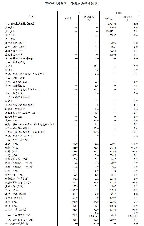 初步核算,一季度国内生产总值270178亿元,按不变价格计算,同比增长4.8%,比2021年四季度环比增长1.3%。分产业看,第一产业增加值10954亿元,同比增长6.0%;第二产业增加值106187亿元,增长5.8%;第三产业增加值153037亿元,增长4.0%。