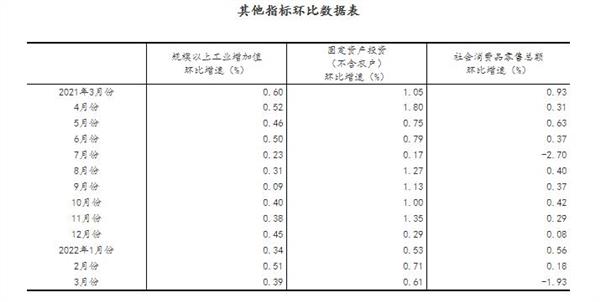 (2)根据季节调整模型自动修正结果,对近一年来各期国内生产总值、规模以上工业增加值、固定资产投资(不含农户)、社会消费品零售总额环比增速进行修订。修订结果及2022年一季度GDP环比数据、2022年3月份其他指标环比数据如下: