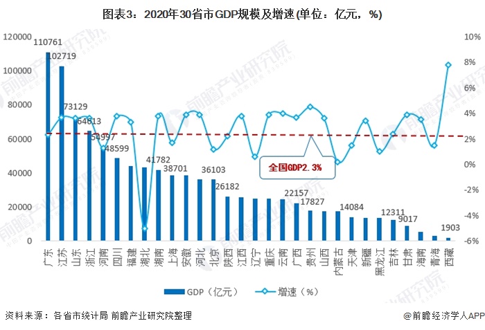 增速方面,30省市中,有18省市超过全国平均水平(2.3%),其中西藏达7.8%,增速最高;广东省增速与全国持平;11个省市GDP增速低于全国水平,但仅有湖北增速为负,为-5.0%,主要是湖北为新冠疫情爆发中心,经济受创较为严重。
